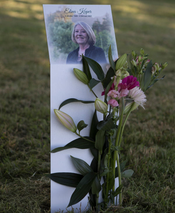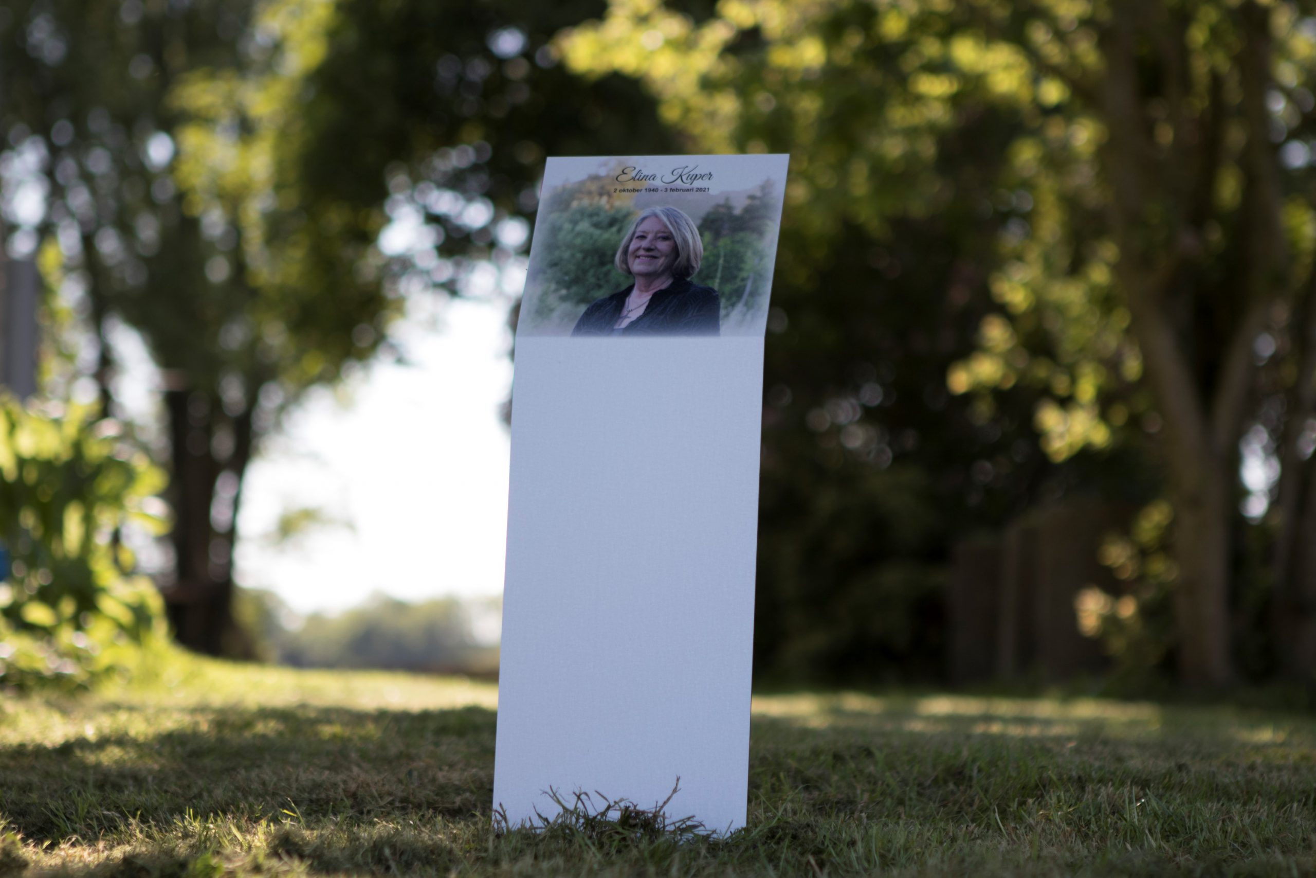 U kunt de tijdelijke grafzerk ook gebruiken bij de herdenkingsplechtigheid van uw dierbare. Door ons stabiele ontwerp kunt u deze duidelijk zichtbaar bij de kist plaatsen. Grafzerk ‘Ljocht’ is gemaakt van gehamerd wit dibond. In combinatie met een full color print maakt dit een uniek herinneringsteken bij de begraafplek.